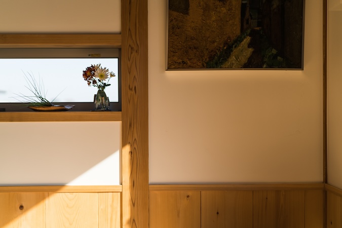 オーナー宅の解体する古い蔵の梁や柱を、少しスケールアウトだが、天井とドア脇に使用した。