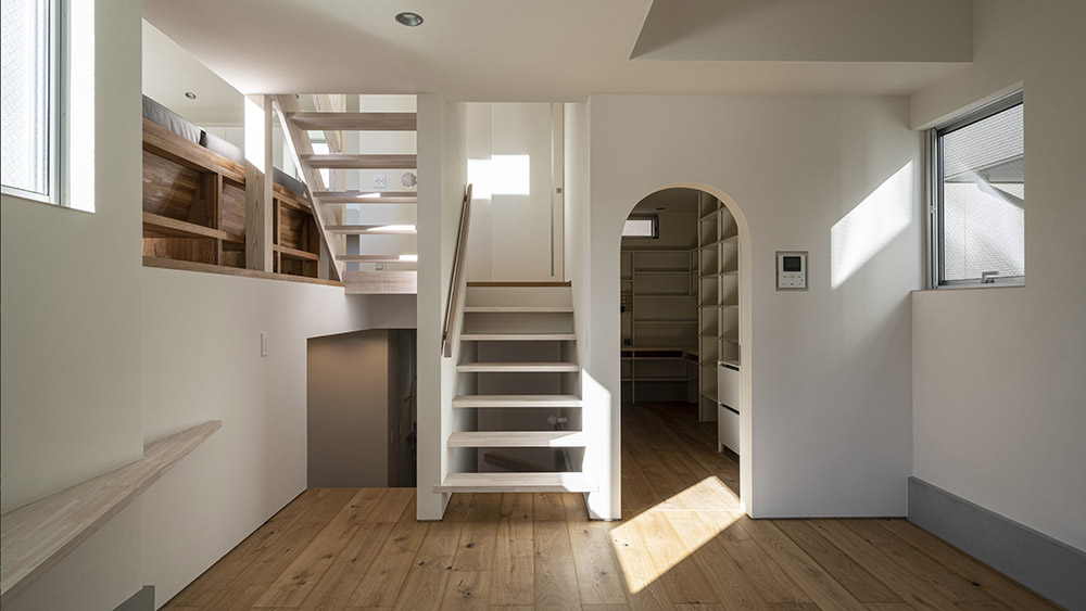 敷地の高低差を生かしたスキップフロアの構成にすることで、