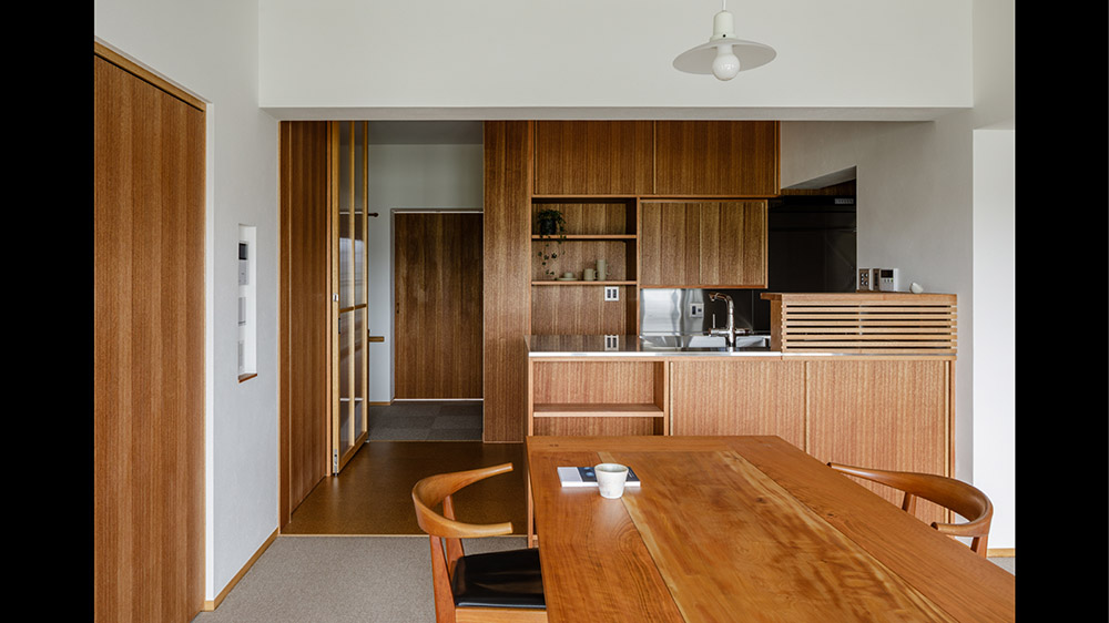 大通りから一本入った、抜け道のような通りにあるこの家は、代々受け継がれた家を、新しい暮らしに合わせて建て替えた住宅です。内装に、以前の家で使われていた建具や材料の一部を再利用、懐かしいパーツを新しい住まいに組み込むことで、単なる建て替えではなく、記憶を継承する家となることを目指しました。