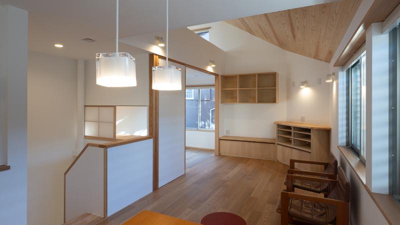 敷地は都心の住宅地で16坪、建坪は10坪強の2階建て、若い4人家族のための住まいです。借地に建つ古い2軒長屋を切り離して住んでいた1軒を建て替えるため、土地に関わる様々な課題を解決しました。