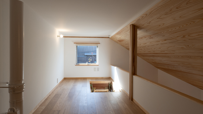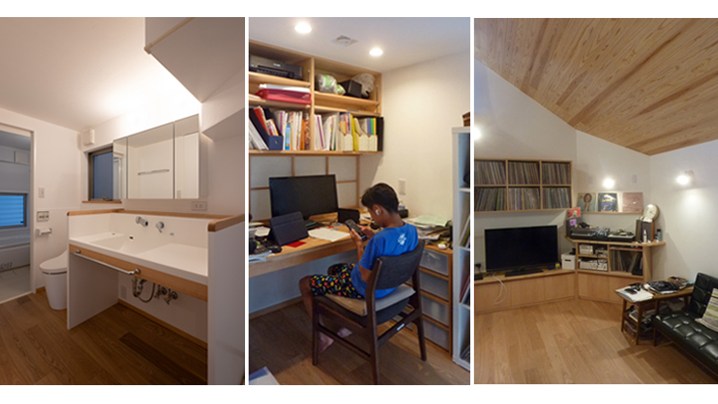 2階は小屋裏へ繋がる吹抜の広がりを感じるLDKと在宅仕事や趣味のDJが楽しめるコーナーがあり、1階は夫婦の寝室と各4畳ほどの子供たちの個室、水廻りの洗面、洗濯、トイレ、浴室があります。