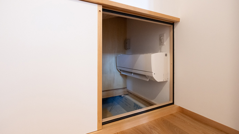 階段下を利用した床下エアコンは戸建て特有の床からの底冷えが無く輻射暖房でとても快適です、窓には視線や日差しを調整する可動ルーバーを設けて人通りの多い周辺環境へも対処しました。