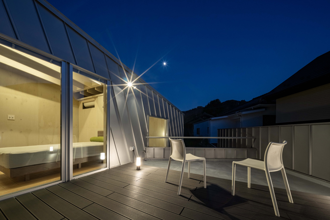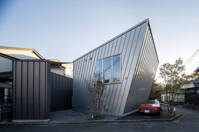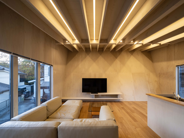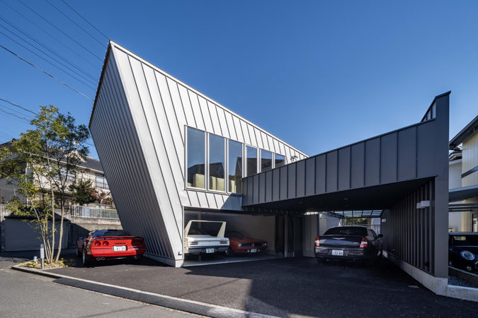 この住宅では、雄大なスケールの自然に囲まれた環境にあって、単体としての建築的存在感を有し象徴的で力強くスカルプチュアルな造形を持つ建築を提案しています。敷地固有の既存境界線に対して多摩川の方向に30度ほど振った軸線をプログラムし、その軸線に沿って建物本体のヴォリュームを配し、それによって生まれる異形余白のスペースを建築全体のデザインに反映させることで特徴的な造形フレームを創り上げています。車を愛するオーナーのために、1Fには大型の車を格納するための2台分のインナーガレージと階段機能に付随するエントランスホールのみを計画し、外部にはその他に最大で5台駐車可能なカーポートスペースを確保した上で、この住宅における居住ヴォリュームは全て2Fにリフトアップしています。居住スペースはほぼワンルームで構成されており、敷地北西角に向かって迫り上がる建物正面の傾斜壁と片流れの勾配屋根に包まれた特徴的なリビング空間は、そのヴォリューム内に南側からの直射光を存分に溜め込み、隣接するルーフデッキと一体となって光溢れる明るい住空間を創り上げています。