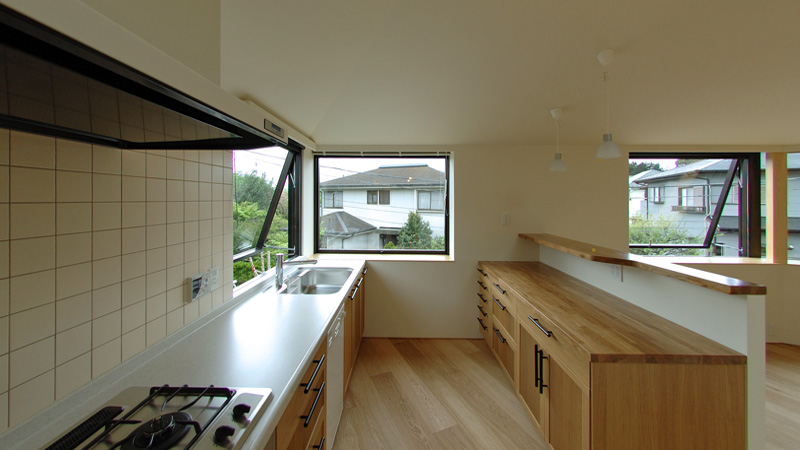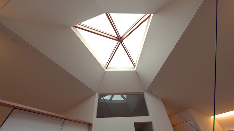 風致地区にあり、道路、隣地からの後退距離をとると敷地中央に5角形の建築可能な場所が残った。これをそのまま建物の形態とし、内部は中心に階段と吹抜け、トップライトを設け各部屋は回遊性のあるドーナツ状に配置している。中央のトップライトは室内を流れる風をコントロールする装置、中心部に光を供給するライトボックスの機能をもたせている。敷地の形状をそのまま縮小したような配置計画のため、トップライトの形状も敷地の相似形となっている。